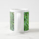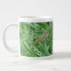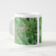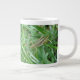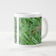 Esta caneca incrível apresenta uma macro fotografia detalhada de um pequeno gafanhoto verde com marcas marrom manchadas sobre a grama. Na fotografia você pode ver os detalhes das pernas unidas, longas antenas e olhos pretos e dourados do gafanhoto.
