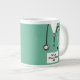 Uma caneca de médico criativo com mato hospitalar, estetoscópio e canivete suíço engraçado no bolso. Para personalizar editar texto para adicionar o nome do médico.