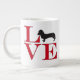 Uma caneca divertida para amantes de dachshund com o texto vermelho empilhado "AMOR" e o "O" substituído por uma silhueta de um dachshund.