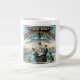 Circa 1885 - Anúncio para Ginger Ale com balão e cesto com tratadores pretos. Duas mulheres bebem Excelsior Ginger Ale, implicando que o carbonato ajuda o balão a subir. Imagem de duas mulheres elegantemente vestidas em vestidos finos e capuzes embarcando em passeio de balão de ar quente, uma fica dentro na cesta segurando um lenço de renda com um operador de balões moído com binóculos e um monóculo, a outra bebe gengibre de um copo quando ela começa a subir uma escada de corda para o artesanato; dois homens afro-americanos com garrafas gengibre frequentem o balão; uma grande multidão de pessoas assiste o espetáculo de bancas atrás de uma cerca branca de madeira pintada com slogans publicitários