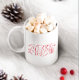 Uma caneca de Natal festiva com texto de tipografia simples, mas clássico, que diz "Feliz e Brilho" com estrelas.