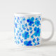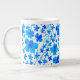Mug gigante em um padrão floral estilo aquarela com flores em tons de azul profundo sobre fundo branco. Flores grandes e detalhadas ao lado de flores menores, mais simples e pedúnculos delicados, para uma sensação látea, botânica.