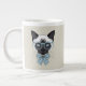Este design apresenta um gato siamês vestido com um par de óculos azuis e gravata de arco.