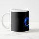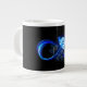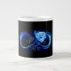 Luminous infinity symbol with glowing, beautiful, lushly blooming rose made of blue flames on black background.