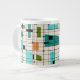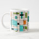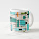 Este Jumbo Mug de Grades Retroativas e Starbursts é onde o estilo vintage encontra o dia moderno. Apresenta um fundo de cor creme com kitschy, quadrados fora de quilter e retângulos em verde, turquesa, Este azul claro, laranja e verde de abacate. Os blocos brancos de cor são sobrepostos são trabalhados em algumas das interseções de grade. Há também retângulos pretos com linhas verticais e horizontais pretas formando um padrão de grade. designs e quadrados pretos de starburst colocados esporadicamente através desta tapeçaria de cores moderna do meio século. Peguem suas botas de partida e fundos de sinos e desfrutem disso nos anos 60.