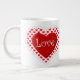 Uma caneca jumbo com um grande namorados de coração vermelho e a palavra Amor escrito nela. Enche a caneca com presentes e Dias de os namorados para uma caneca de presente de Namorados.