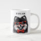 Comece seu dia com um traço de beleza usando o Nerd Vermelho Pomeraniano Cute de Óculos de Coffee Gigante. Esta caneca sobredimensionada apresenta um adorável Pomeraniano em uma ilustração preta e branca, adornada com óculos de nerd vermelho e uma gravata de arco de búfalo na moda vermelho e preto. Faça-o exclusivamente seu, adicionando um nome personalizado, e salve suas bebidas favoritas nesta charmosa e personalizada caneca gigante de café.