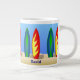 Esta caneca de café com tema de surfe tem pranchas coloridas e "Surfer Dude" de um lado e seu nome personalizado do outro. ideia de presente de excelente para um surfista!