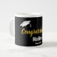 Um boné branco está acima do texto falho (não em folha) de ouro que diz 'Parabéns. Na parte inferior da caneca preta, branca e dourada, você pode editar o texto da exibição branca para inserir o nome do formando. Além disso, você pode editar o ano para a classe de formando.