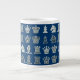 Mug jumbo apresentando design de xadrez com peças de xadrez escuras e claras em filas sobre fundo azul.