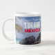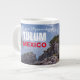 Mug gigante de café apresentando as pirâmides maias pelo Mar Caribe em Tulum, Riviera Maya, no México