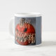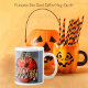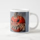 Esse desenho gráfico, foi digitalmente editado, para aprimorar, essa vibrante, laranja e negra abóbora, com menacing, resmungão, em direção à direita, contra cinzas azuis, fundo, com Feliz Halloween, Emblazonado, ao longo da frente, em letras macabras, cor pálida, que aparecem.