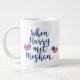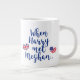 NewParkLane - Royal Wedding Jumbo Mug, com uma citação divertida "Quando Harry encontrou Meghan", em tipografia de escrita azul, e as bandeiras do Reino Unido e dos Estados Unidos em forma de coração. Também disponível em tipografia vermelha. Verifique se há itens correspondentes nesta coleção. Você tem desejos pessoais específicos de design? Sinta-se livre para me contactar!