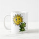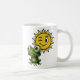 Un mug décoré d'un image d'une petite grenouille caricaturée, une grosse tête, de gros yeux globuleux, une grande bouche et un petit corps, c'est plutôt rigolo, elle est assise dos au soleil qui fait un clin d'œil, pas de chance il ne va pas pleuvoir aujourd'hui.