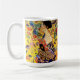 Café Mug com pintura de óleo de Gustav Klimt Lady com ventilador (1918). Uma mulher vestindo um quimono azul segura um fã vermelho contra um fundo amarelo colorido de flores e pavões. Um presente de excelente para fãs de arte japonesa e europeia.