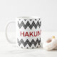 De " frase africana HAKUNA MATATA" para "nenhumas preocupações". Pensado nós todos precisamos esta filosofia sem problemas a um momento ou outro ao longo de nossas vidas. Design de texto com um teste padrão de ziguezague original. Procure outros estilos, cores e tamanhos das canecas para escolher de.