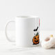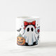 Adicione um charme fofo ao seu colar de Halloween com esta caneca fantasma festiva! Apresentando um fantasma branco amigável com grandes olhos pretos, arco vermelho e pés brancos, este personagem estilo desenho animado traz uma energia alegre para a estação assustadora. Por um lado, o fantasma segura um clássico jack-o-lanterno, enquanto o outro levanta um copo de vinho tinto em comemoração. Colocado sobre fundo preto profundo, o design é acentuado com estrelas cintilantes minúsculas e dois morcegos voadores por um toque extra festivo. Um presente perfeito para amantes de Halloween, apresentadores de festas, ou qualquer um que queira desfrutar de seu café ou cacau em estilo assustador!