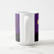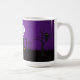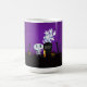 Uma caneca de café divertida e assustadora com um design de halloween fofo. Colocado em um cemitério escuro e assustador. Um cascalho diz RIP, com uma vela e alguns crânios brilhantes no chão. Uma vedação cremosa velha se inclina para o lado. Um adorável esqueleto sorridente está acenando e alguns fantasmas legal estão girando no ar. Uma coruja senta-se na árvore com olhos brilhantes e uma lua crescida está ao lado com morcegos voando nas proximidades. Definido em um plano de fundo de gradiente roxo.