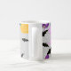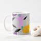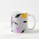 Esta caneca de café branca apresenta cores e fantasmas não tradicionais do Halloween, teias, cogumelos, morcegos e flores.
