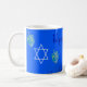 Esta caneca tem uma design de sonho Chanucá, Estrela de David, e "Feliz Chanucá" em um fundo azul. Excelente para a estação.