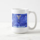 Uma menorah Hanukkah de ouro brilhante e um "Hanukkah Feliz" em textos brilhantes, azuis e brancos sobrepõem-se a uma imagem fractal azul e branca que lembra os flocos de neve numa tempestade. Chag Sameach!