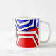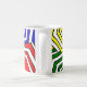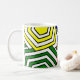 Esta caneca tem um design Bauhaus de hexágonos concêntricos sobrepostos em vermelho, amarelo, azul e verde.