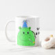 Uma caneca divertida para um aniversário. Um hipopótamo verde num chapéu de festa com a buzina e uma alegria. Hip Hip Hooray, é o seu aniversário!