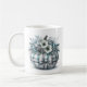 Holiday coffee mug is shown with a cute wintery blue plaid pumpkin floral print.