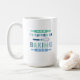A cute coffee mug for the baker in your life with "I'd rather be baking" in a fun retro font with illustrations of rolling pins and a whisk in blue.