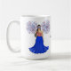 Ilustrações da moda de 4 de julho com grandes fogos de artifício na caneca de fundo. Desenho bonito e feminino de uma mulher em uma camisa listrada e uma longa saia azul. Ela também está vestindo óculos de sol de estrela azul. Bonita e única design de caneca de 4 de julho para o verão. Adicionar um nome para torná-lo mais personalizado.
