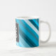 As características deste design da caneca listram várias máscaras coloridas do azul, da cerceta ou do aqua, inspirados pelas cores das águas dos oceanos, dos mares, dos lagos e dos rios. Igualmente caracteriza uma letra inicial personalizada do nome ou do sobrenome em uma pia batismal interessante dentro de uma área quadrada escura. Poderia ser dado como um presente personalizado a alguém que tem um nome ou um sobrenome que comece com a letra inicial.