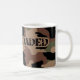 A caneca branca com "carregou inteiramente" o slogan na pia batismal militar do estilo do exército contra o fundo da camuflagem (tans, verdes, marrons e preto)