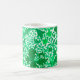 Caneca de café com estampa floral vintage de William Morris de lírios e íris estilizados, digitalmente aprimorada e colorida, em tons de verde jade claro a escuro sobre um fundo branco