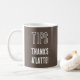 Uma bela caneca de compro de café no moderno estilo urbano contemporâneo. Com um fundo de tom castanho clássico. Apresenta tipografia urbana, com a mensagem divertida " Dicas, Obrigados a'latte ". Um na moda para um compro de café barista, café, bistro, restaurante ou qualquer negócio de comida ou bebida.