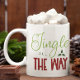 Esta caneca festiva de café mostra a imagem de texto "Jingle All The Way" em tipografia verde e vermelha com folhas sagradas. Perfeito para o feriado.