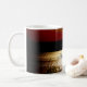 Uma caneca de café com uma foto de um pôr do sol sobre o Lago Mais Cedo, localizada em Oklahoma.