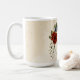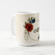 Caneca de café única com flores românticas em laranja queimada e azul naval e folhas verdes.