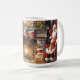Uma caneca bonita para o Natal, com o Pai Natal sentado ao lado de uma lareira quente e ruidosa pendurada com meias vermelhas e decorada com o verde de Natal. Há uma bonito árvore de Natal e presentes embrulhados em ouro com fita vermelha. Personalizar com nome, monograma ou iniciais.