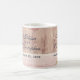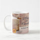 Comemorativa de casamento ou de favores de caneca com um tema de país rústico. Uma lata velha de leite enferrujante com uma flor amarela bonito ao lado. Trigo e flores cor-de-rosa desbotadas no fundo, colocadas sobre um painel de madeira esmaecido. Personalizado com seus nomes e data de casamento.