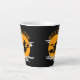 Design de Halloween divertido para amantes de chá. Bruxa numa vassoura com pote de chá rastejante com lua laranja e nuvens.