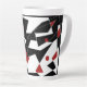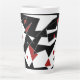 Várias formas geométricas brancas e vermelhas estão espalhadas sobre um fundo preto, criando um forte contraste. Algumas formas são interconectadas com linhas brancas finas, e pontos vermelhos adicionam um pop de cor à composição.