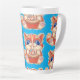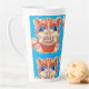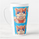 Um gato de desenho animado com olhos grandes e brilhantes está balançando uma pizza enfeitada de peixe e outros sapos. O uso lúdico de cores e recursos exagerados adiciona um toque caprichoso.