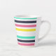 Uma caneca latta colorida com um padrão listrado. É principalmente branca com faixas horizontais em preto, rosa, amarelo e turquesa.