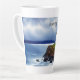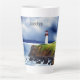 A caneca de na moda latte apresenta um farol vermelho e branco sobre penhascos cobertos por grama que estão sobre o oceano e céus turvos no horizonte - uma aquarela digital gerada por IA. Personalizar com nome ou monograma