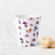 White latte mug with all around pattern of knitting needles, balls of yarn and cats pulling yarn. Gradient colors are maroon, blue, pink and golden brown. Choose either the small or tall latte mugs.