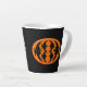 Esta incrível caneca latta apresenta um oval laranja com seis corvos. Cada corvo tem olhos amarelos com pupilas pretas e asas salientes. Os corvos voam em direção uns aos outros formando uma forma oval. O fundo é preto.