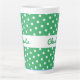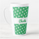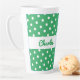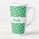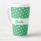 Uma caneca de latão verde e branca com padrão de bolinhas retrorreflector. Personalize a caneca com o nome do destinatário para um presente individual de na moda.