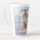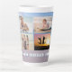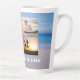Caneca de café alta com fundo de cena de praia. Personalize com quatro modelos de foto e texto ao longo da parte inferior. Um mar azul calmo e areia lisa da praia são o pano de fundo para compartilhar algumas fotos divertidas das crianças, férias, animais de estimação e momentos em família.