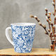 Uma caneca de café latta com um padrão floral William Morris (18134-1896) intitulado Sunflower (1879) numa paleta azul e branca clássica. Grandes girassóis com videiras e folhas de uva graciosas. Ele foi um artista britânico durante o período das artes e artesanatos, que desenhou papel de parede e têxteis.