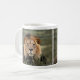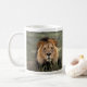 Um leão alerta levanta sua cabeça e é agarrado enquanto reclina entre gramas verdes.